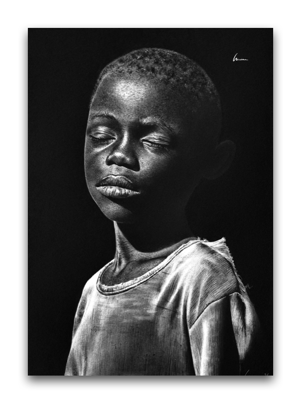 Contemplamos a un niño africano con los ojos cerrados. Representa la inocencia y vulnerabilidad, ofreciendo una mirada introspectiva en medio de un mundo frecuentemente caótico y violento. La presencia calmada del niño sugiere una voluntad de paz y armonía, recordándonos la importancia de proteger la infancia en todas sus manifestaciones.